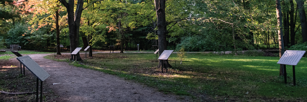 This 400m nature trail also runs through Mitigwaaki Forest, and was developed by working with Anishinaabe Elders and Knowledge Holders as well as Anishinaabe environmental scientists. The trail contains four interpretive signs that are designed to foster viewers understanding of the forest from an Anishinabek perspective and call them to act on how we can better treat Mother Earth.